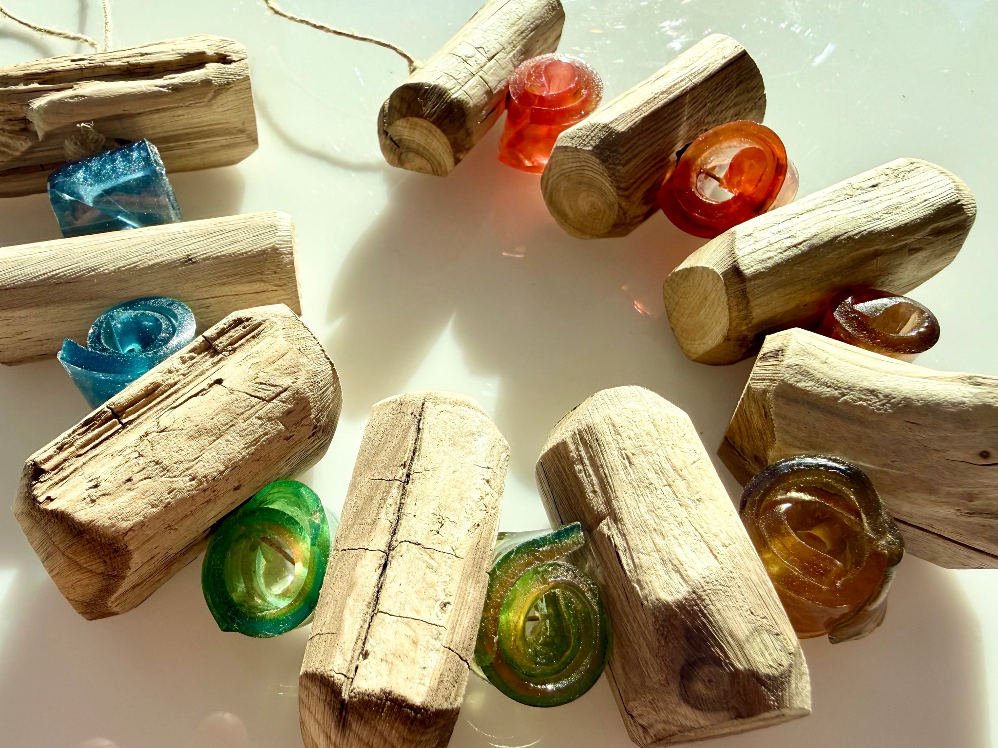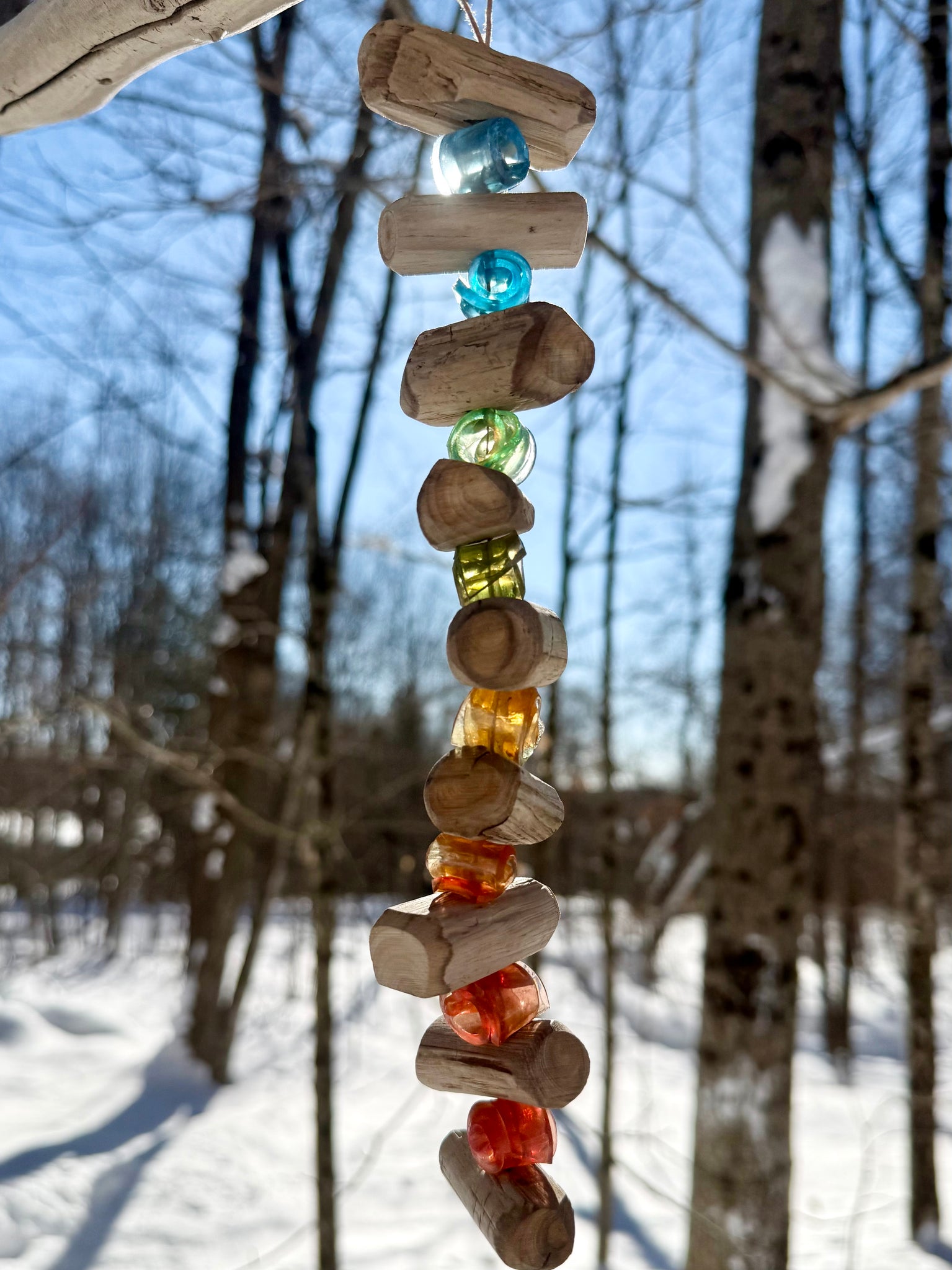 Chunky little driftwood branch blocks set between colourful hand rolled beads strung onto hemp twine.
