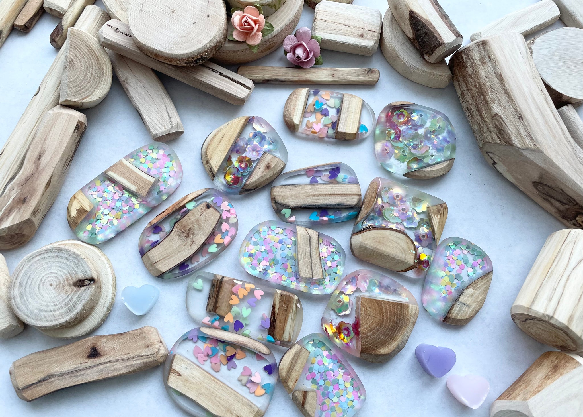 12 Little blocks made of resin and wood, with lovely spring coloured bits inside.