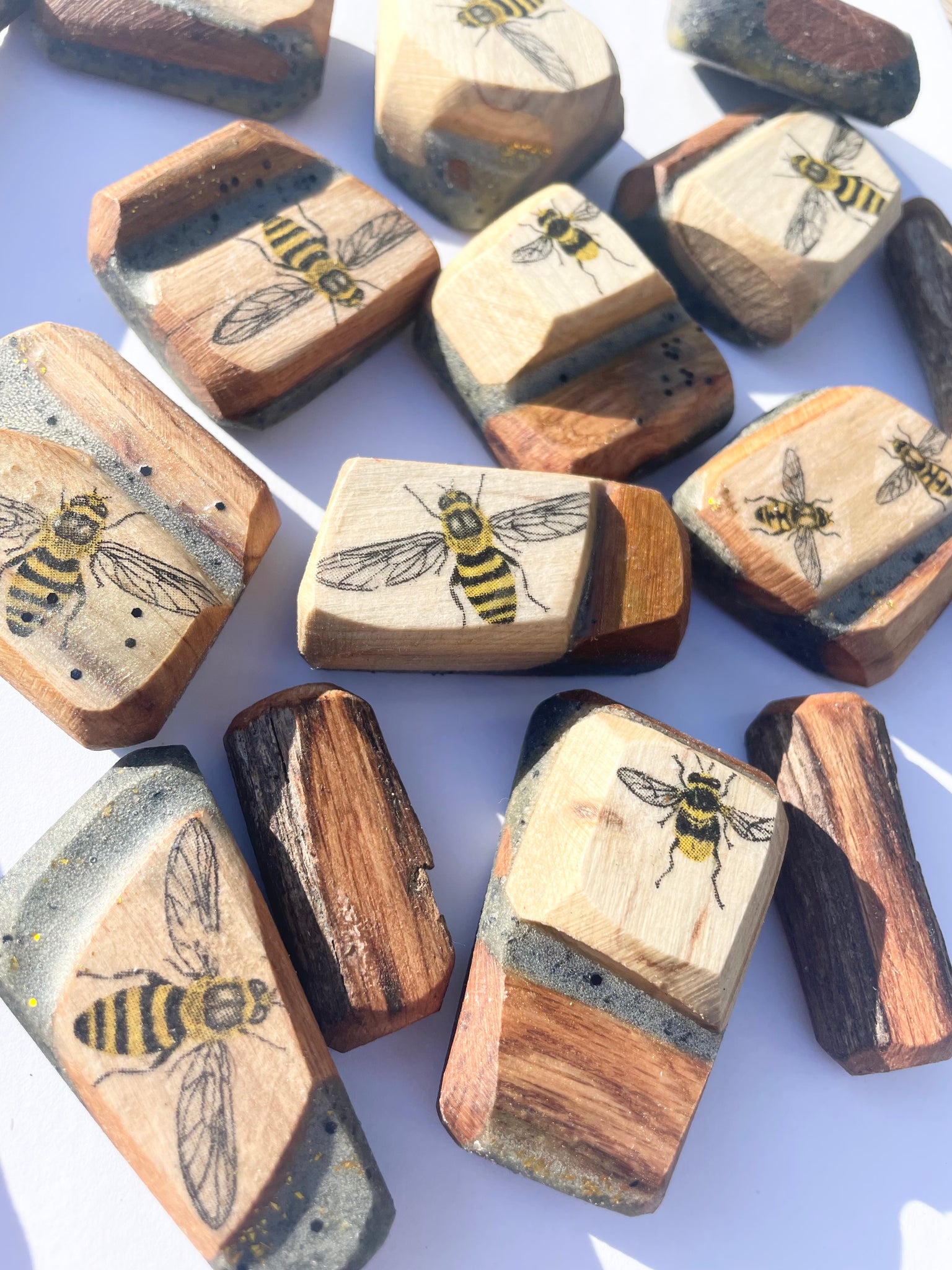 4 Chunky little blocks made of resin and branches.